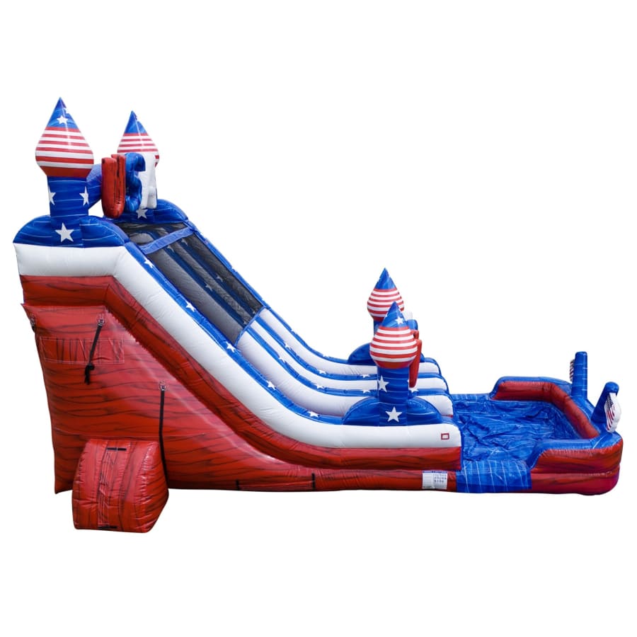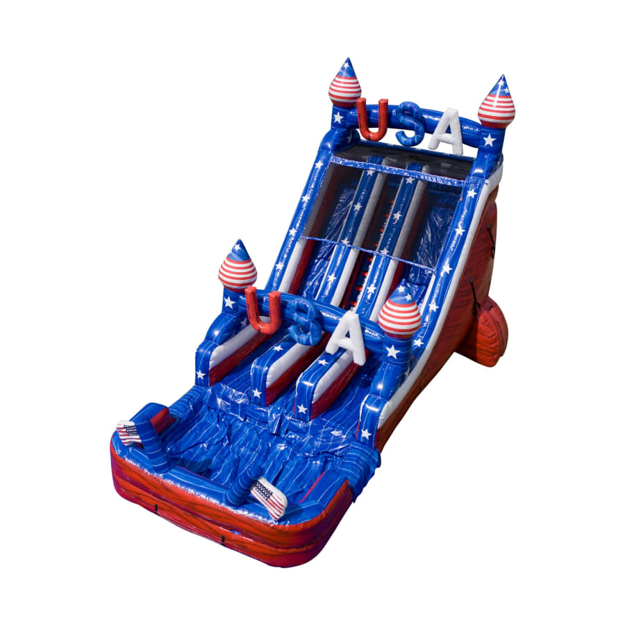 🎆 Dive into a high-speed adventure with the 18ft USA Dual Slide! Proudly boasting a vibrant red, white, and blue design, this inflatable slide guarantees a star-spangled rush of excitement. Perfect for a variety of occasions, this slide is a must-have for any event seeking a splash of patriotic fun.