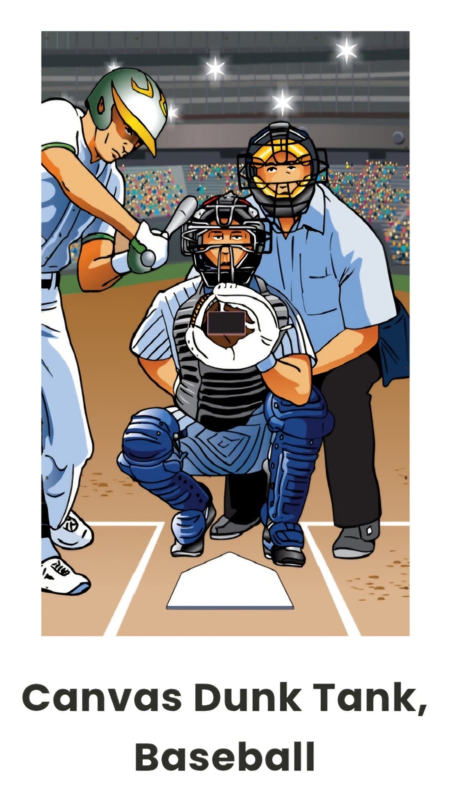 The dunk tank comes with a yellow canvas, and you have the option to choose a baseball or clown-themed canvas for an additional $20.